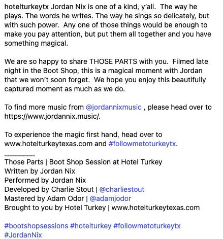 Playback speed×Share postShare post at current timeShare from 0:000:00/0:00Transcript1Those PartsBoot Shop Session at Hotel TurkeyJordan Nix MusicAug 01, 20251ShareTranscriptThank you to Hotel Turkey!www.hotelturkeytexas.com SubscribeDiscussion about this videoCommentsRestacksJordan Nix MusicSubscribeAuthorsJordan Nix MusicRecent PostsLive with Jordan Nix MusicOct 3 • Jordan Nix MusicLive with Jordan Nix MusicOct 3 • Jordan Nix MusicHIGH & DRYOct 1 • Jordan Nix Music"Both Ends" on RLRMSep 15 • Jordan Nix MusicEasy TigerSep 10 • Jordan Nix MusicANNOUNCEMENTAug 26 • Jordan Nix MusicNew Music - Lights Go OutAug 18 • Jordan Nix Music and Jordan NixMy My MyAug 11 • Jordan Nix Music and Jordan Nix